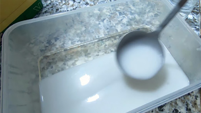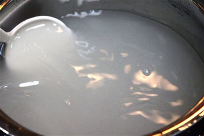 1. Đong khoảng 2 lít nước cho vào cái nồi to, đổ vào 25g bột rau câu vào ngâm chừng khoảng 15 phút cho rau câu nở. Sau đó bạn dùng muỗng to bạn khuấy đều cho bột được tan hết trong nước.