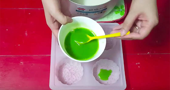 Bạn chuẩn bị một cái khuôn có hình bánh trung thu để bắt đầu đổ rau câu. Múc một ít nước rau câu cho ra một cái tô, cho một vài muỗng lá dứa vào để có màu xanh lá rồi đổ lớp đầu tiên, nhớ là đổ mỏng thôi nha. (Các bạn có thể mua dụng cụ làm bánh tại đây)