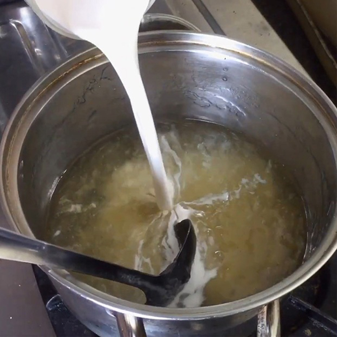 Đợi hỗn hợp sôi nhẹ thì thêm sữa tươi vào, liên tục khuấy để sữa hòa quyện cùng những nguyên vật liệu khác. Khi thấy hỗn hợp sôi nhẹ thì tắt bếp .