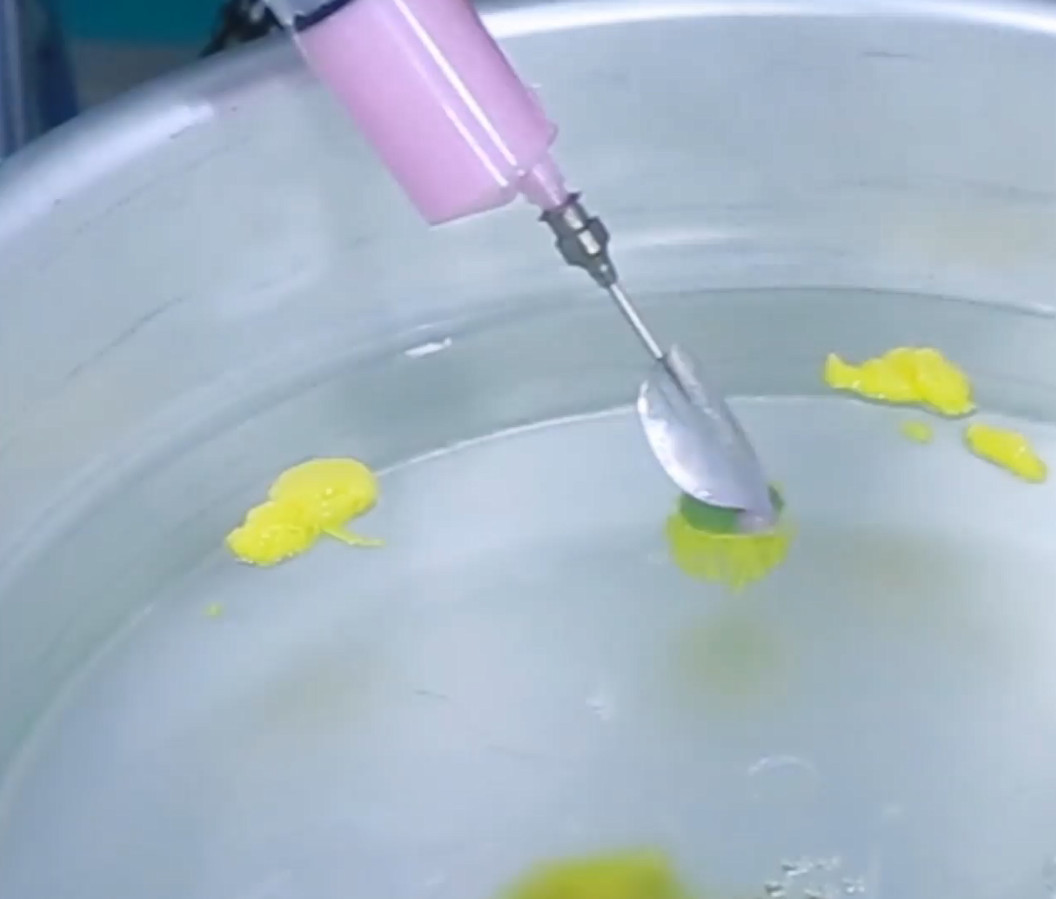 - Lấy bơm kim tiêm hút rau câu màu lên trước, sau đó gắn thìa vào phần đầu của kim tiêm. Dùng thìa hình tròn để múc 1 muỗng thạch chính giữa để tạo hình nhụy hoa, từ từ bơm thạch màu vào trong. Sau khi bơm xong thì dùng thìa hớt bỏ phần thạch rau câu thừa ra ngoài, để riêng.